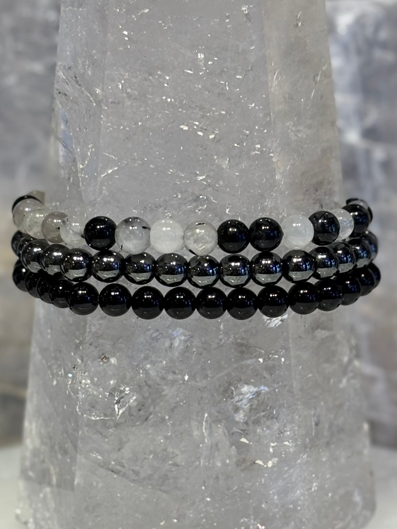 Protection & Grounding, Set of 3 Beaded Bracelets. Tourmilated Quartz, Hematite, and Black Tourmaline.