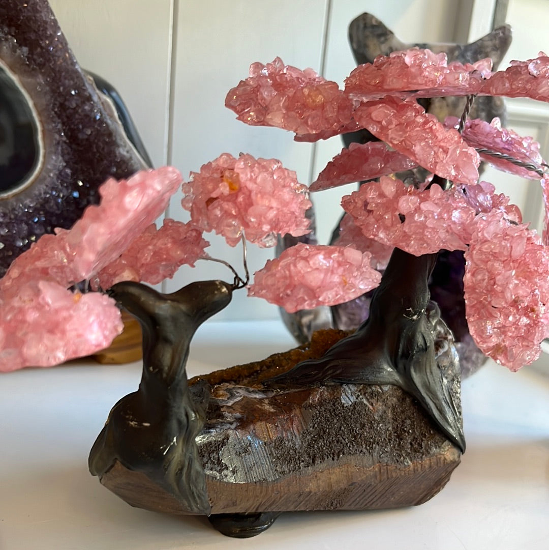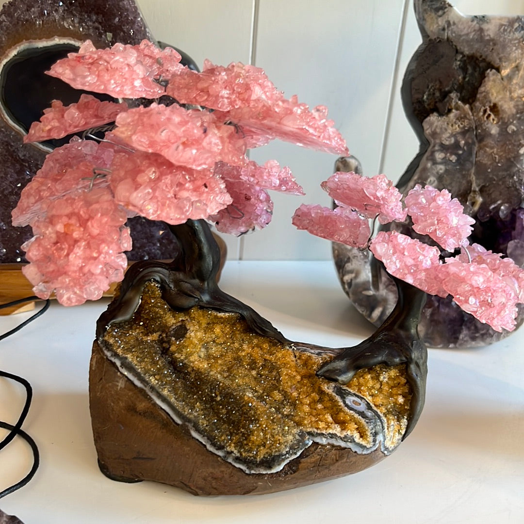 This tree is Rose Quartz with a Druzy Citrine base.