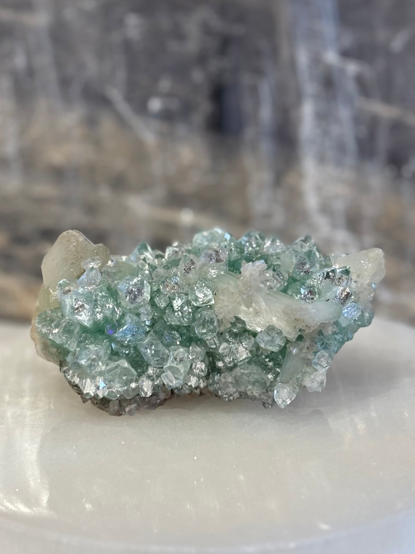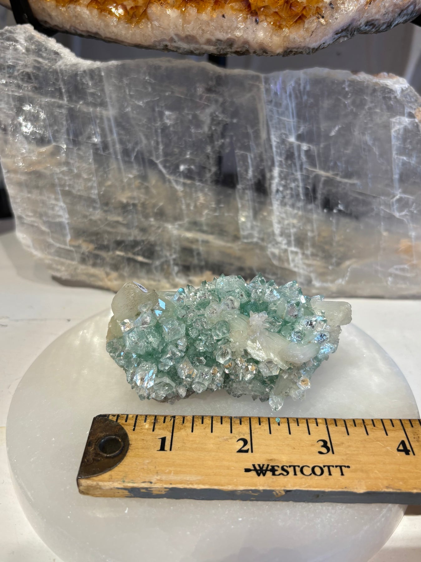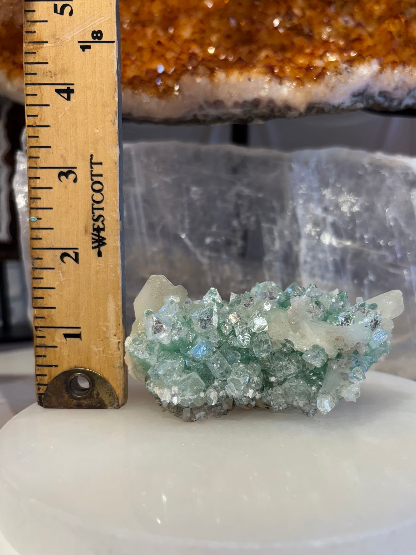 Green Apophyllite Cluster. Approximately 1 1/2 inches high x 3 1/2 inches wide x 2 inches deep. From India.