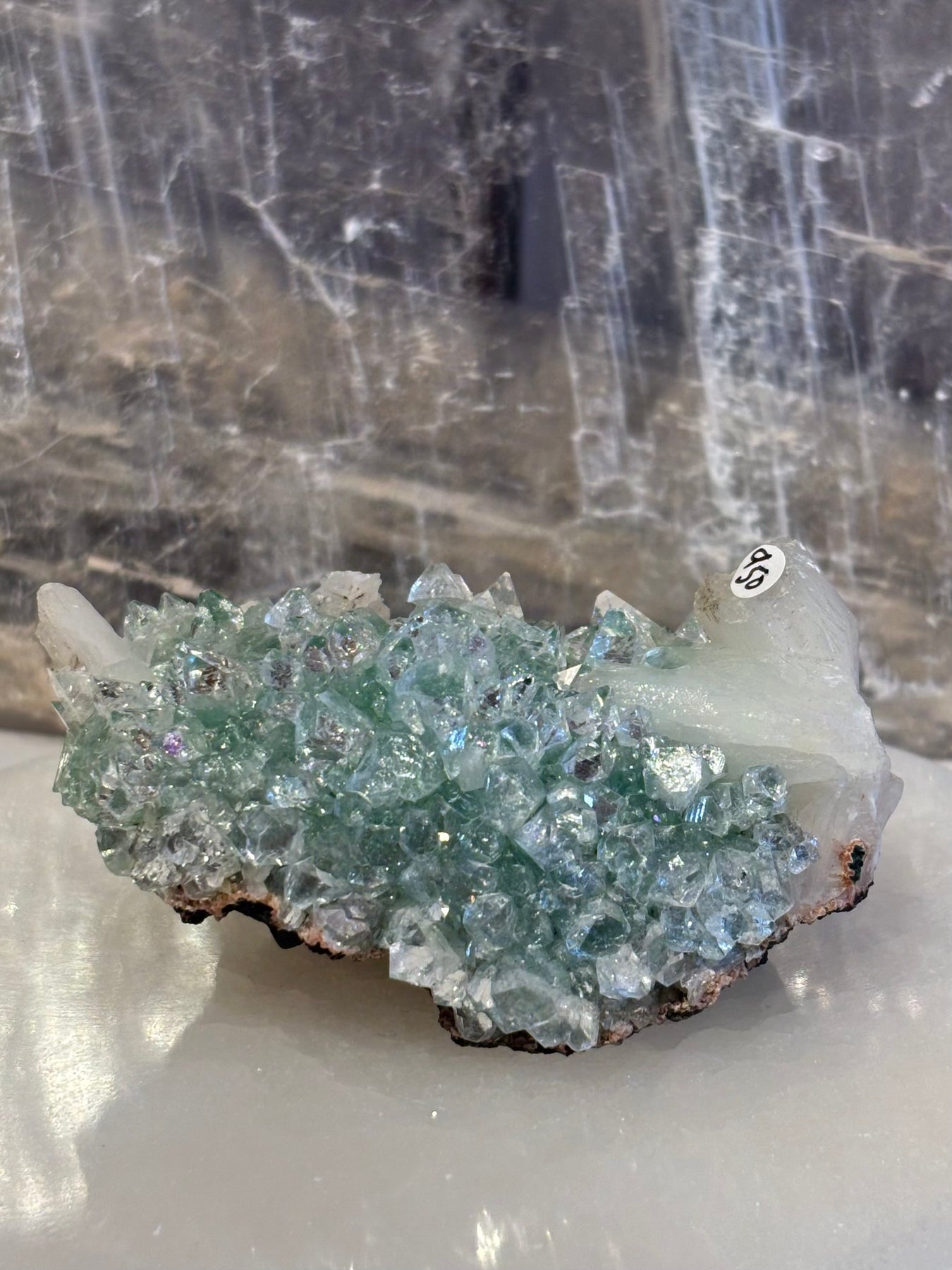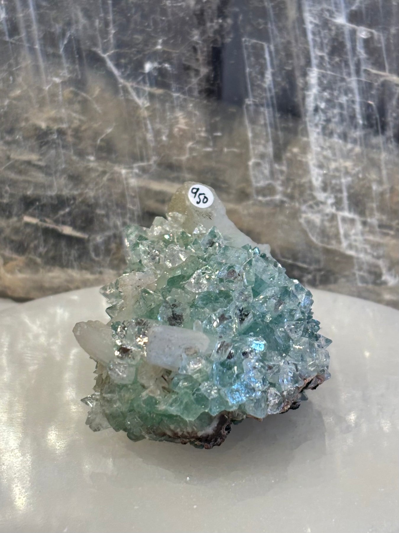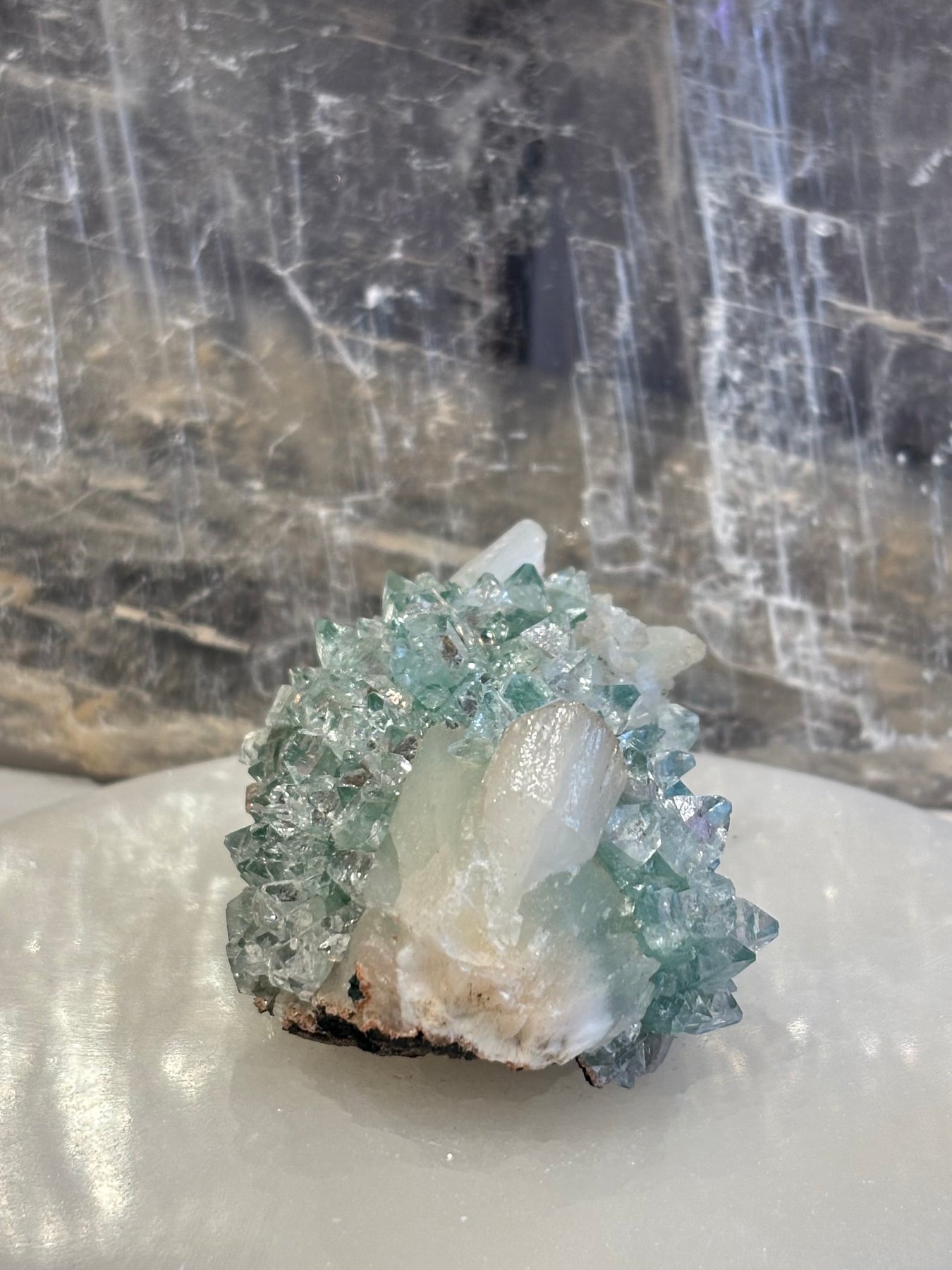 Green Apophyllite Cluster. Approximately 1 1/2 inches high x 3 1/2 inches wide x 2 inches deep. From India.