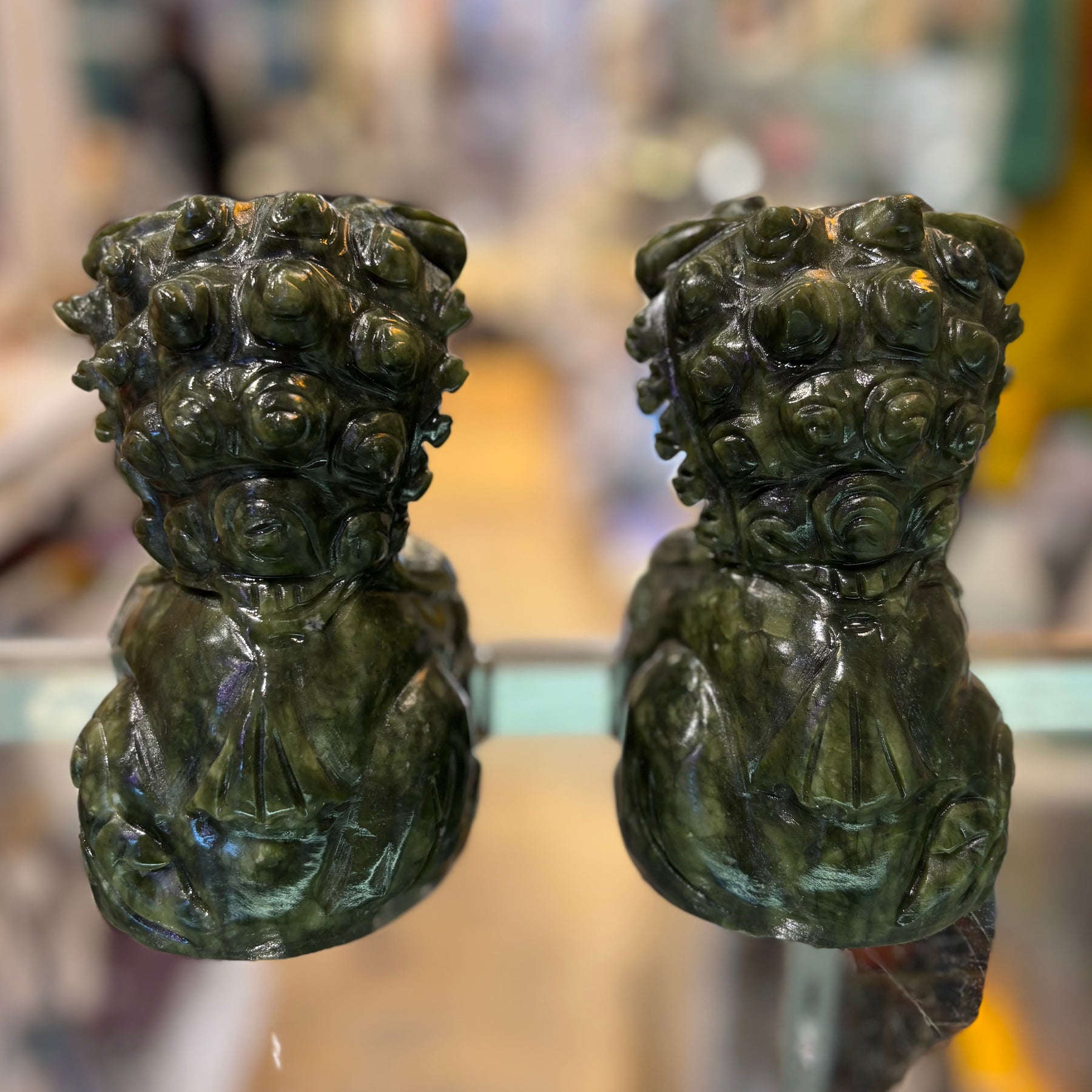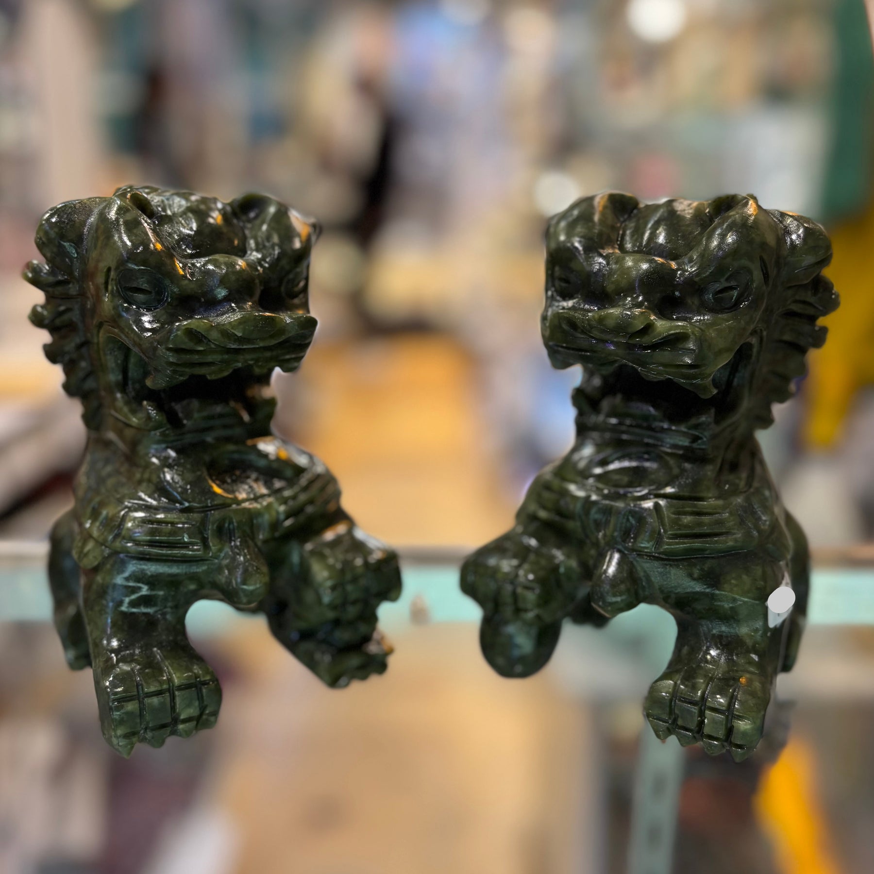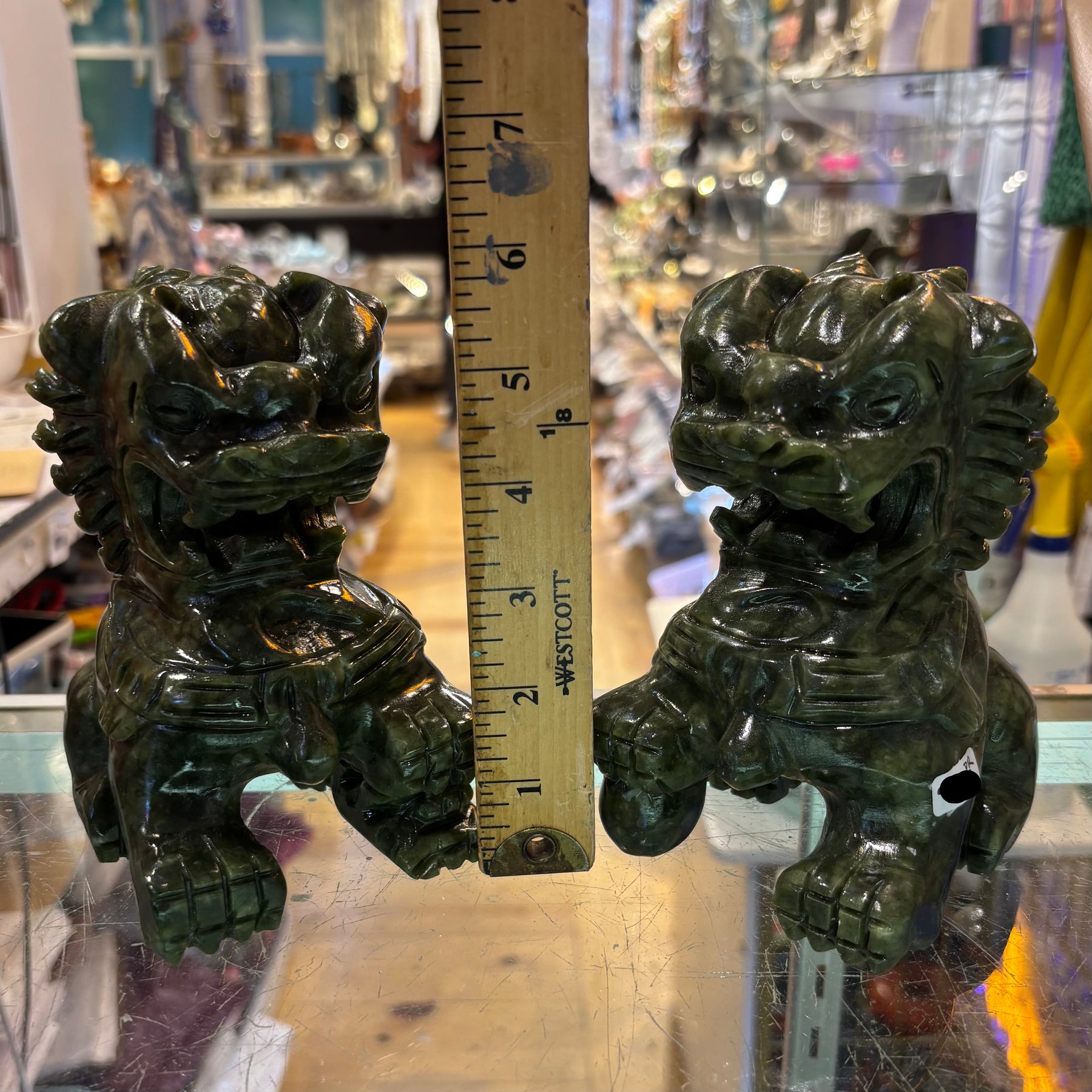 Jade Foo Dogs Pair. Each Foo Dog is approximately 5 1/2 inches high x 3 3/4 inches wide x 4 3/4 inches deep.