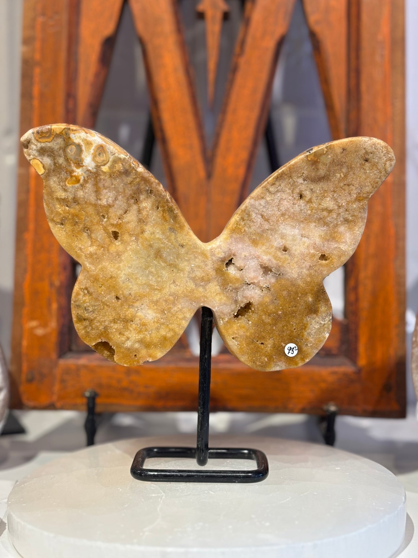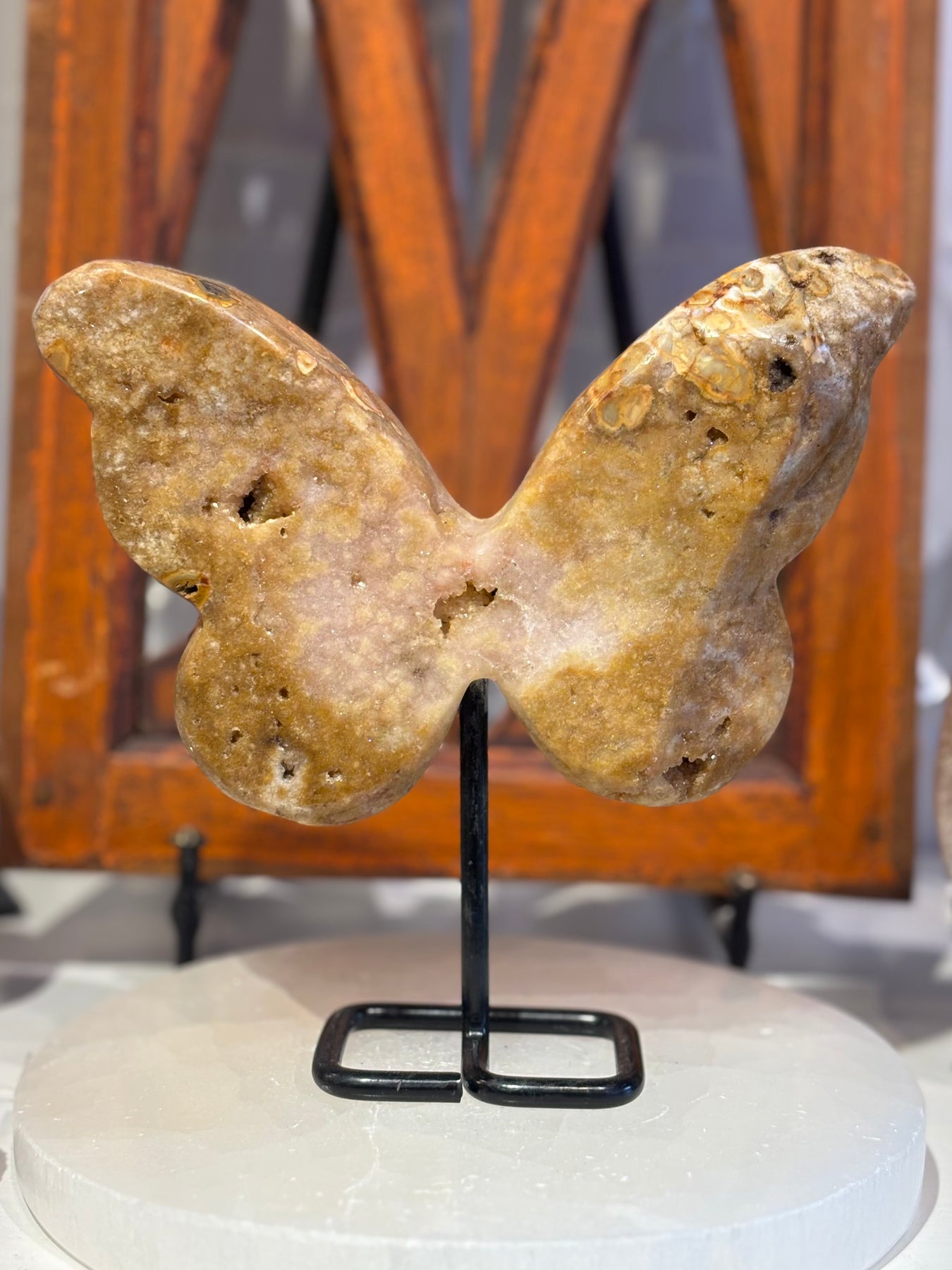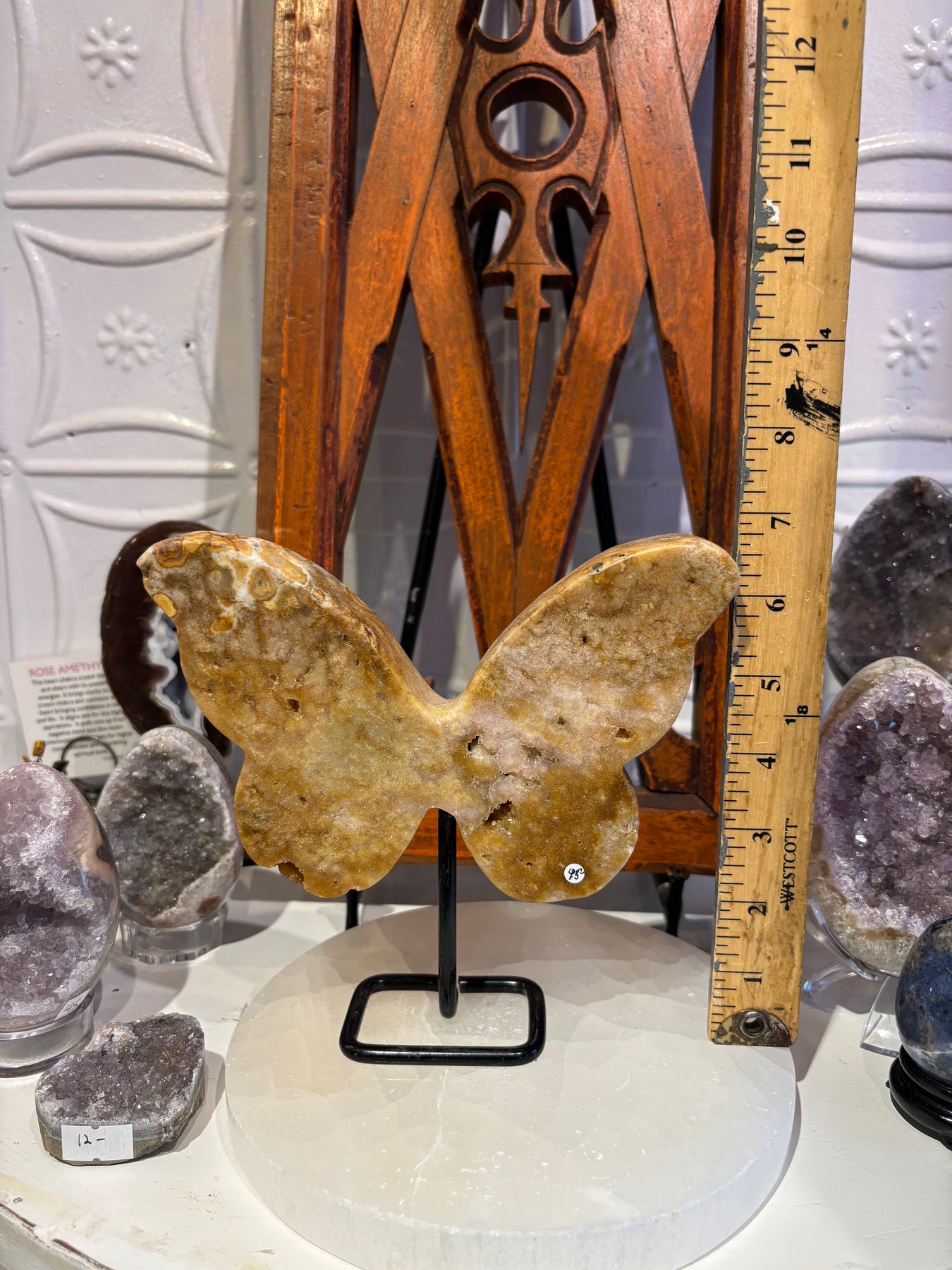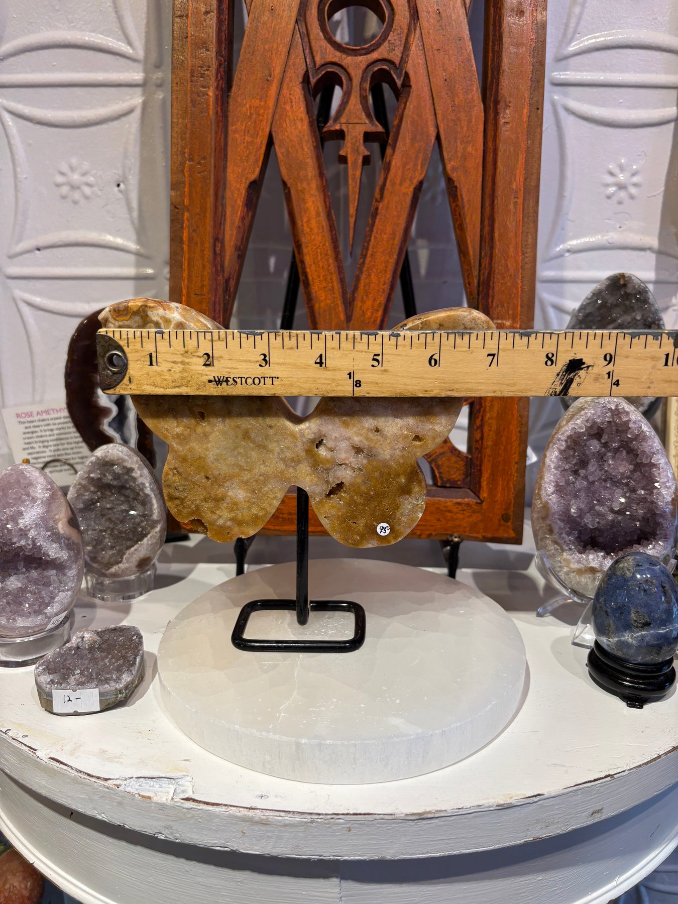Rose Amethyst Butterfly with Metal Stand. Approximately 6 3/4 inches high x 7 inches wide x 1 1/4 inches deep.