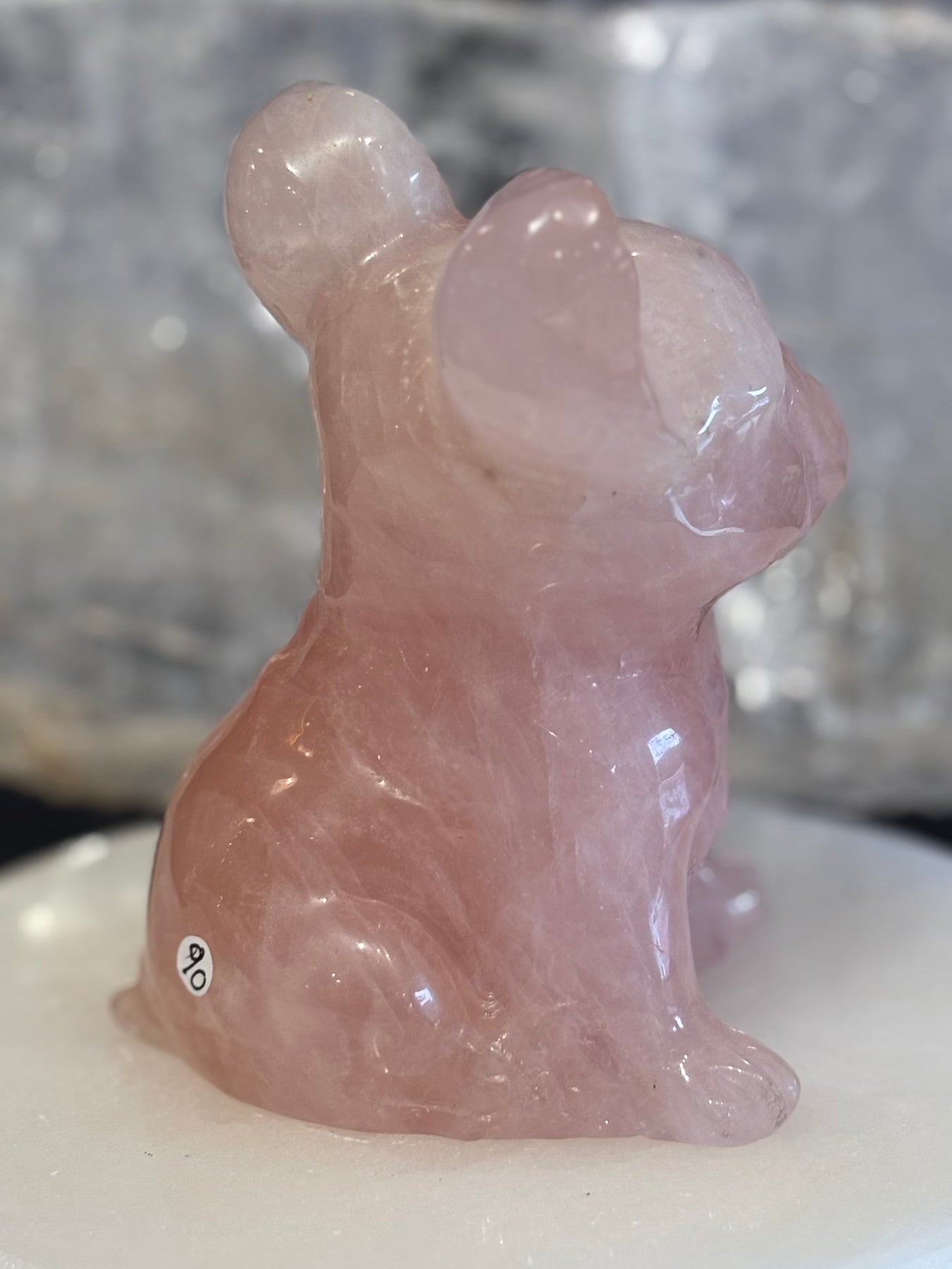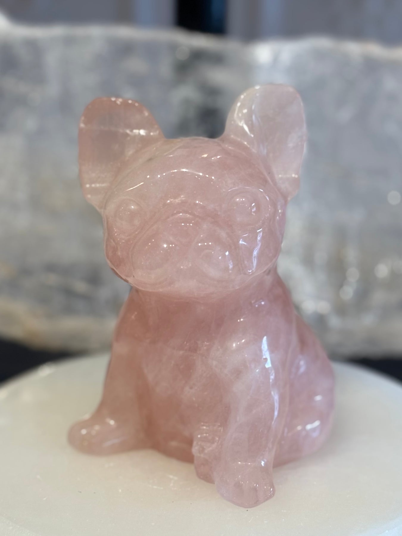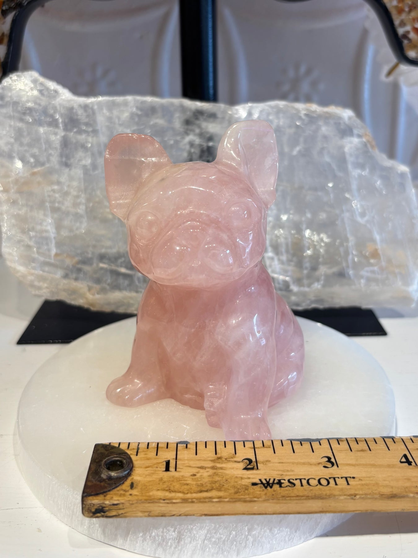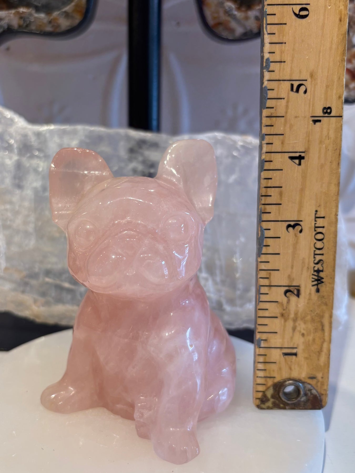 Rose Quartz French Bulldog Figurine. Approximately 4 inches high x 2 1/2 inches wide x 3 1/4 inches deep. Each figurine may vary slightly in size and tone from the one pictured.