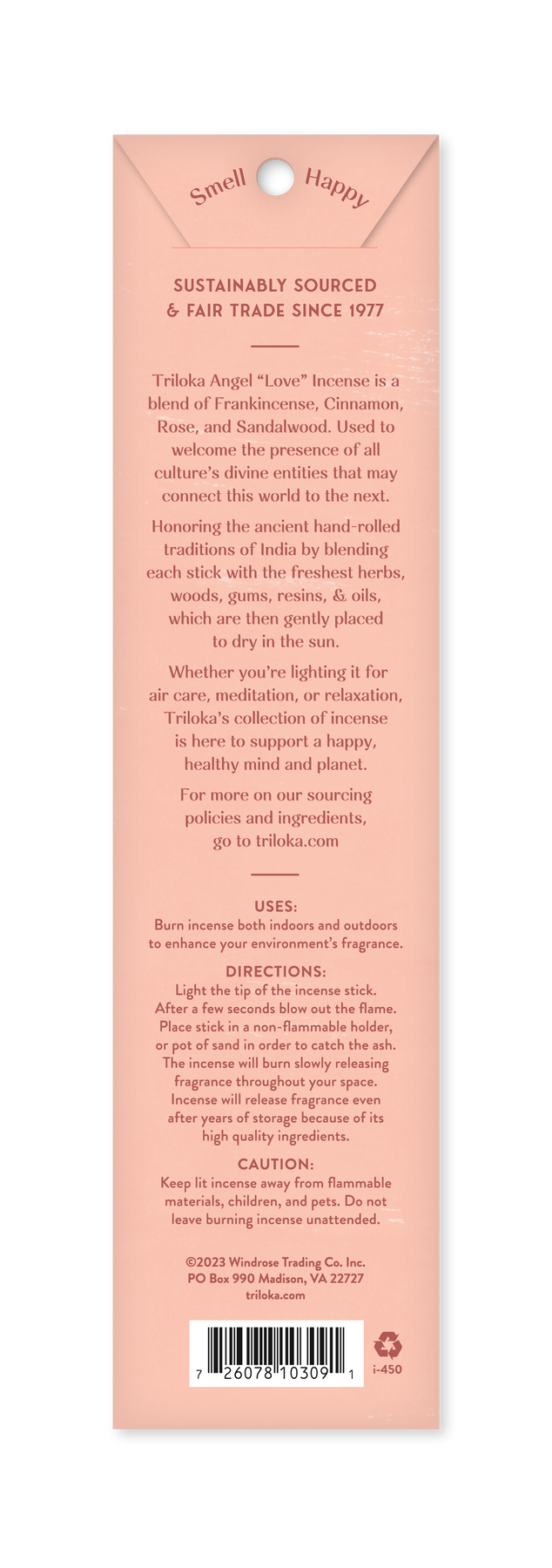 Triloka Angel of Love Incense: A blend of Frankincense, Cinnamon, Rose, & Sandalwood. Promote the presence of angels, the divine entities that connect this world to the next, and enhance your meditation, prayer, or relaxation with this unique line of natural incense. 10 sticks per pack. Made by our valued supply partners in India.