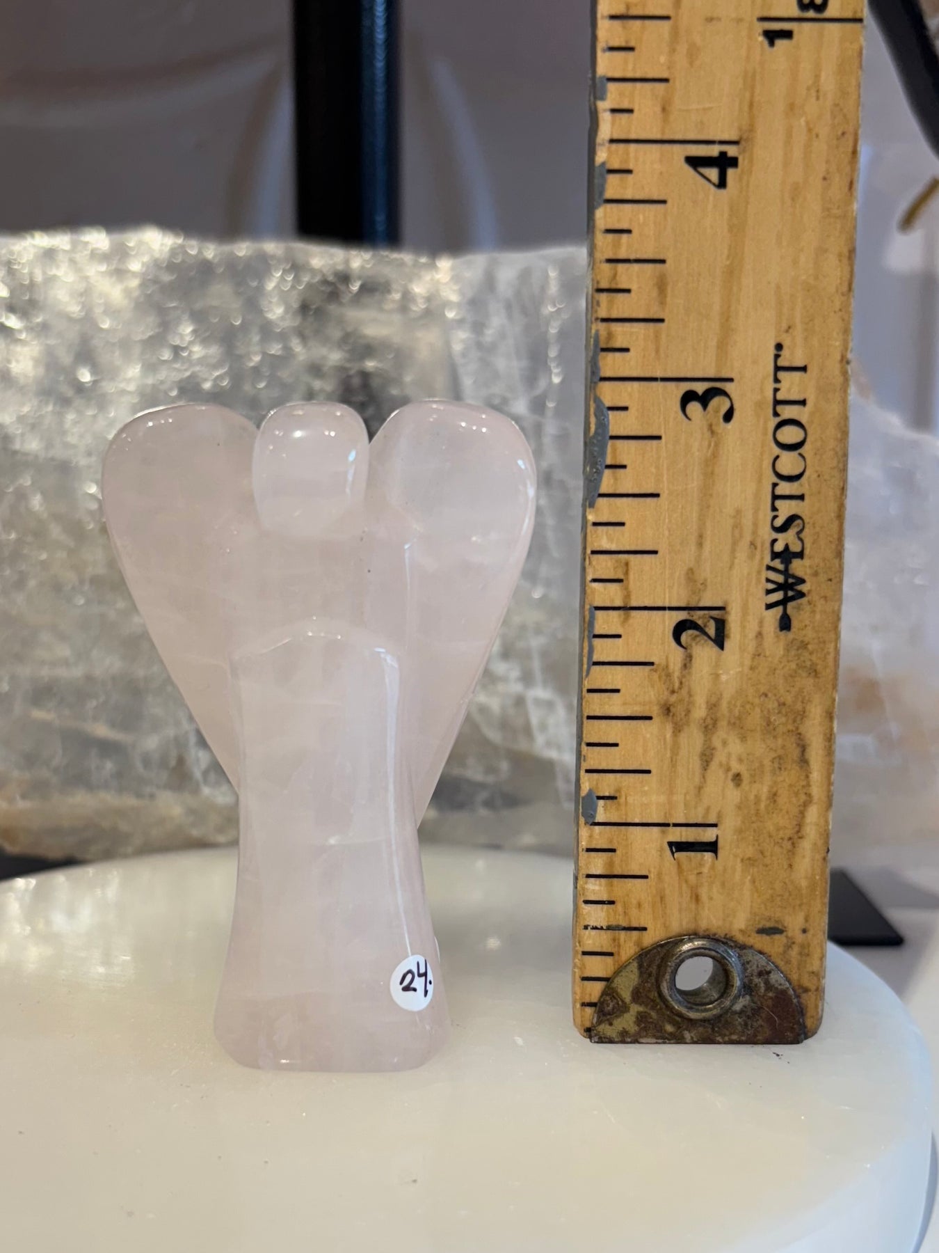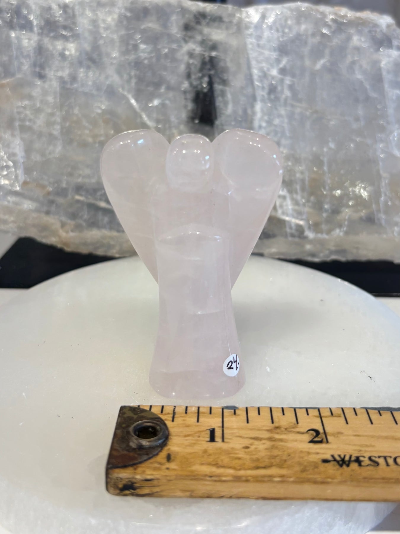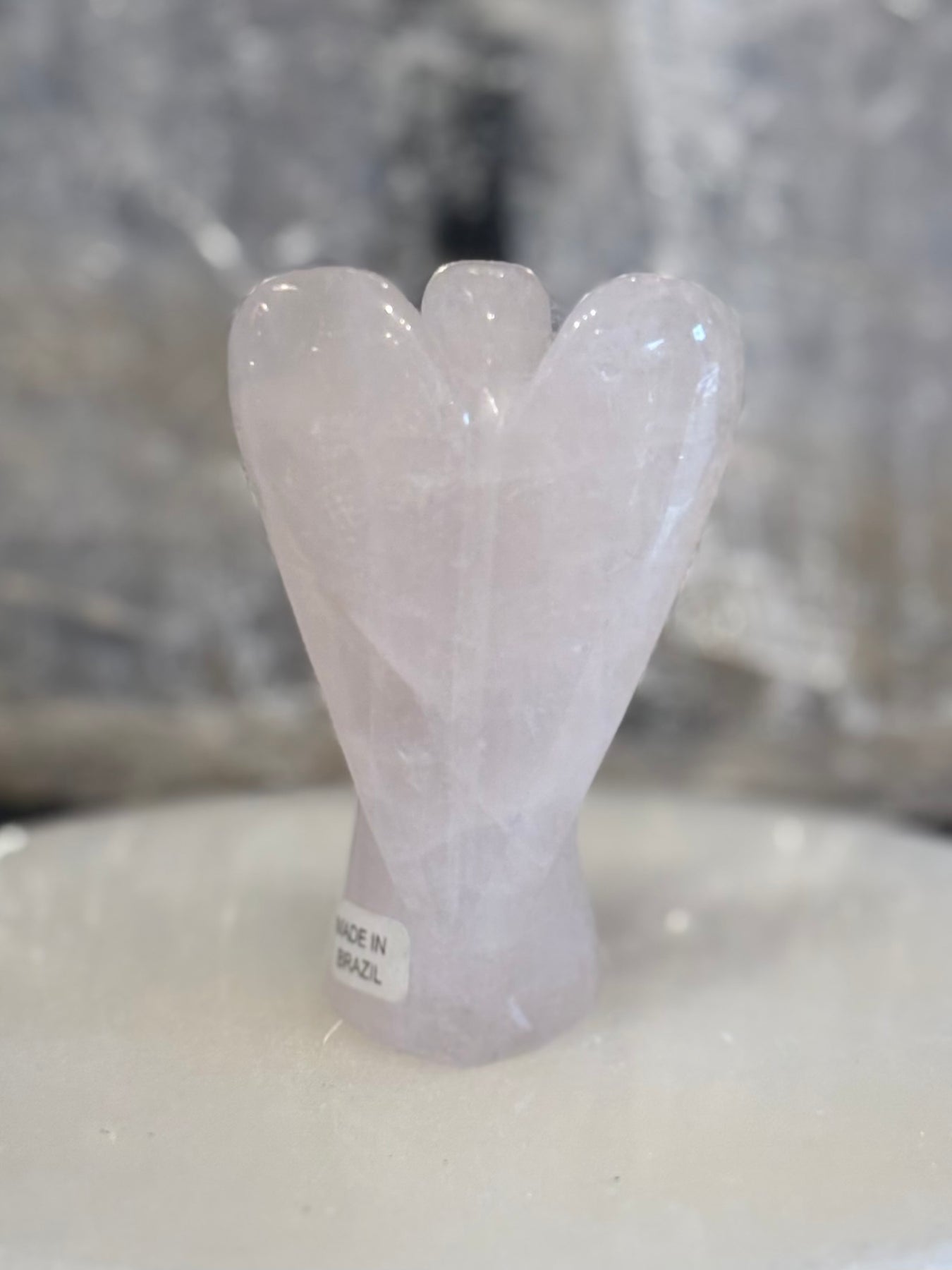 Rose Quartz Angel Figurine. Approximately 3 inches high x 1 7/8 inches wide x 1 inch deep. Made in Brazil.