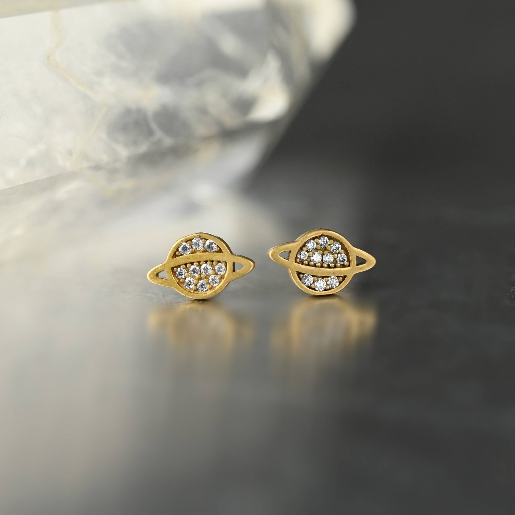 These tiny brass studs feature a small Moon & Saturn with tiny stones that you can wear together, or separate. Metal: Brass with Surgical Steel Posts Size: small 7- 8mm Handmade with Art & Soul in Los Angeles