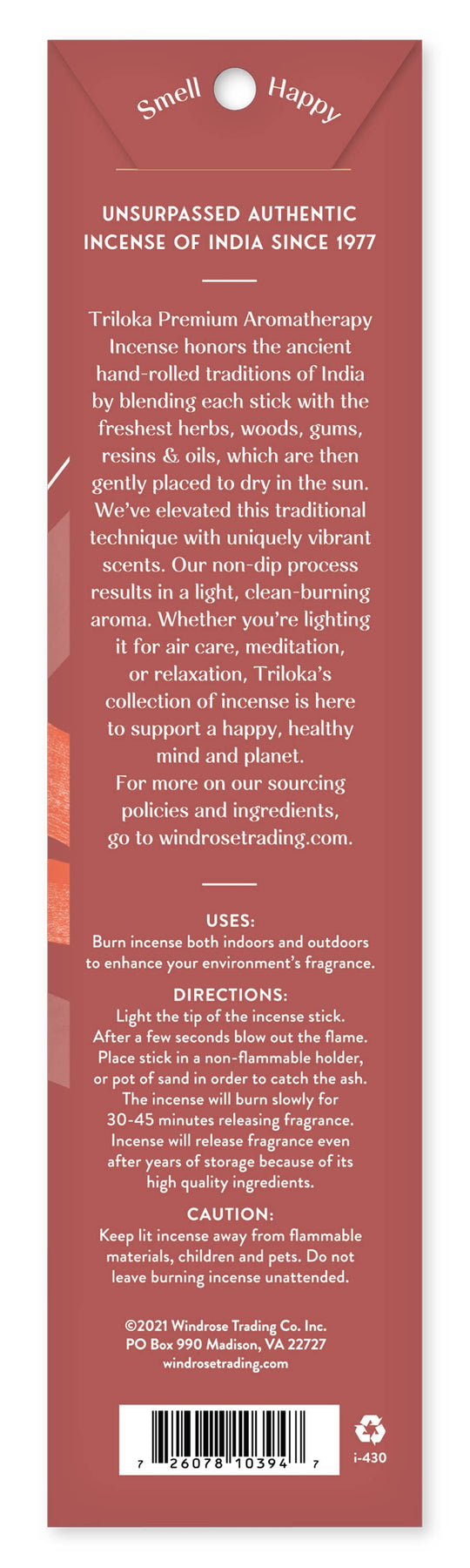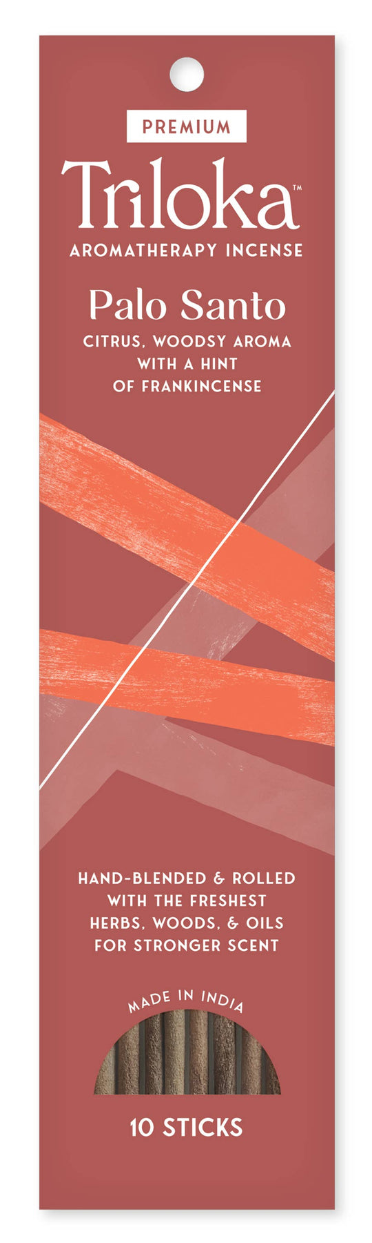 Triloka Palo Santo Premium Incense: Healing-Purifying-Cleansing. Palo Santo has a citrus aroma with underlying hints of frankincense. Palo Santo, Holy Wood, has been used for thousands of years by shamans for healing in Ecuador and Peru. Only after the tree has died and the wood remained in its natural habitat for years does its sacred, medicinal and mystical properties manifest. Triloka incense is hand-made according to ancient masala method, a tradition that has been passed down through incense-crafting families in India for generations. This tried-and-true process blends sandalwood, herbs, gums, woods, resins, and oils to form a paste (masala) which is then hand-rolled onto a fine bamboo sticks to dry in the sun. This method creates incense with a long-lasting fragrance that leaves a subtle aroma even after the incense has gone out. 10 sticks per pack. Handcrafted in India by our valued supply partners.